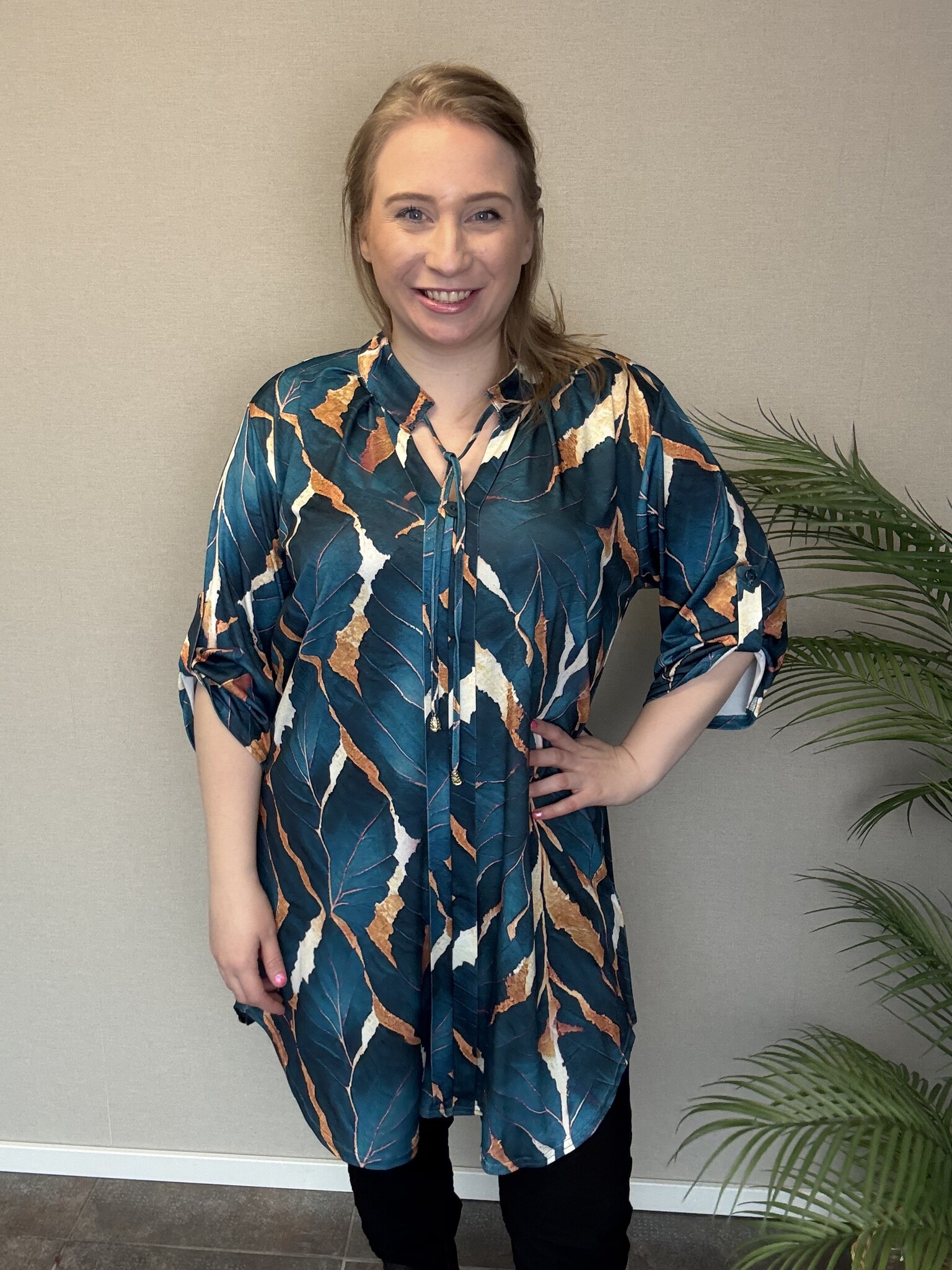 De B-2204 van Magna Fashion is een doorgeknoopte blouse met ¾-mouwen. De mouwen zijn op te stropen tot een luchtige blouse, dat maakt het samen met de stretchstof tot een comfortabel model! De blouse heeft een elegante blauwe bladerenprint met witte en gouden accenten.