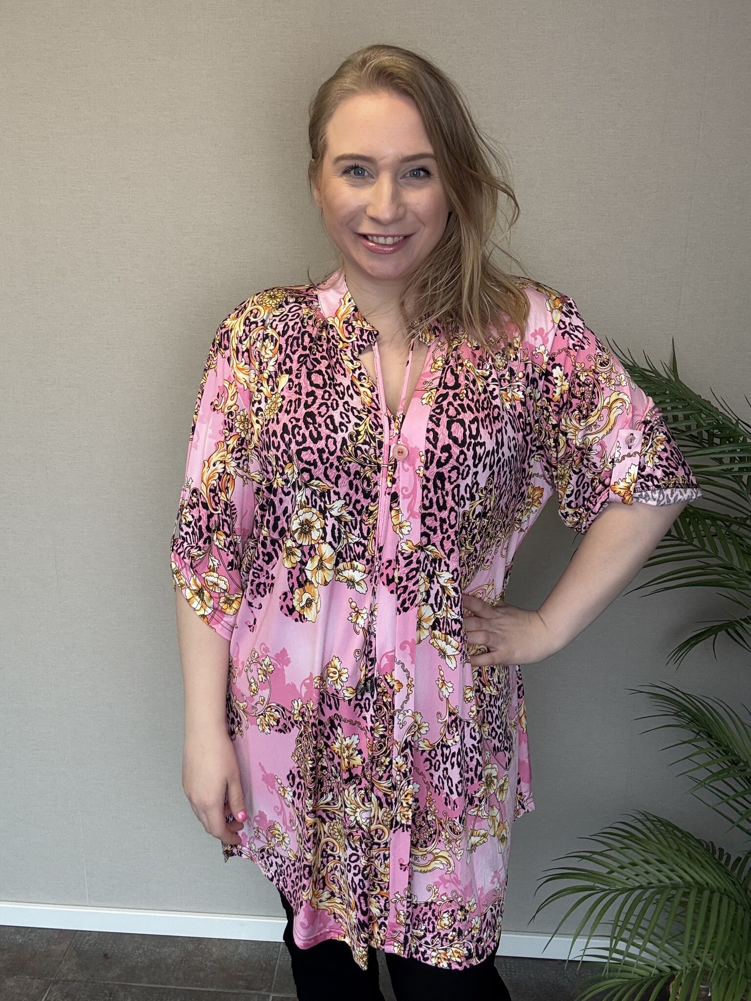 De C-2121 tuniek Jutta van Magna Fashion heeft half lange mouwen die je kan ophalen tot de elleboog. Rond de hals zitten koordjes met hieraan nestels. De mooie roze kleur met de gele bloemenprint maakt dit een elegant model. Ideaal om te dragen in het voorjaar of met een mooie blazer op de koudere dagen.