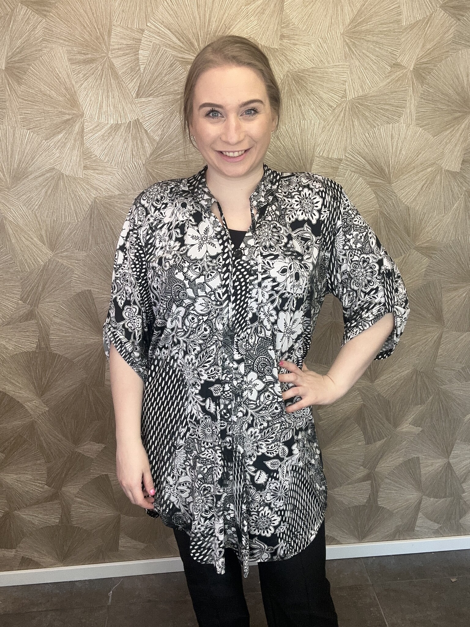 Tuniek Ninthe in dit C-2121 model van Magna Fashion is een comfortabel model met half lange mouwen die je kunt ophalen tot de elleboog. De koordjes rond de hals hebben aan het uiteinde nestels die je tot een strik kan opknopen, maar ook mooi los kan dragen. Een tijdloos item door de zwart met witte kleuren.