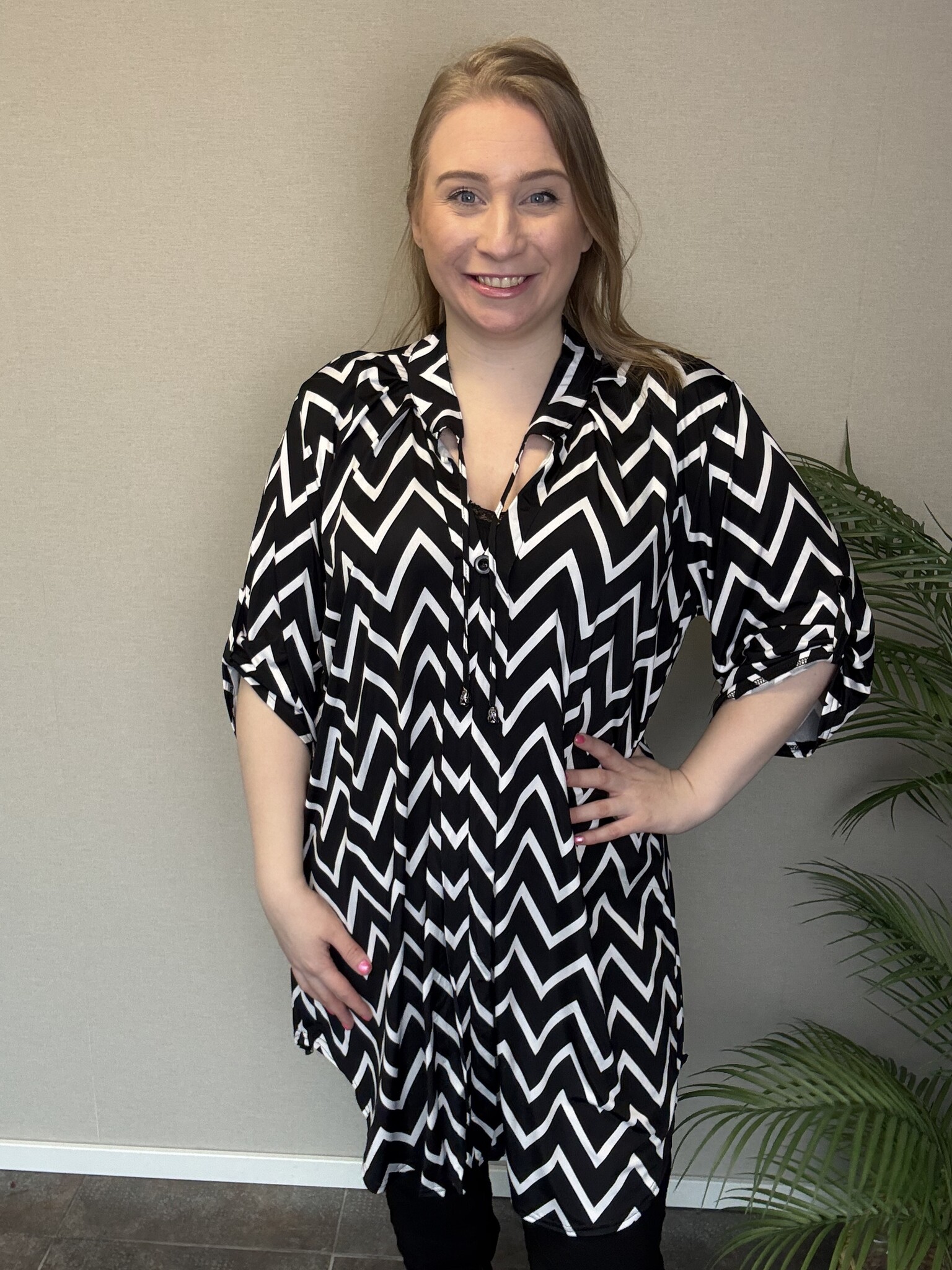 Tuniek Zigzag is een comfortabele tuniek uitgevoerd in het klassieke model C-2121 van Magna fashion. De tuniek heeft koortjes ronde de hals met nestels aan het uiteinde. Door de print is tuniek Zigzag ideaal om eindeloos mee te combineren of los over een legging te dragen. De mouwen vallen tot een halflange mouw en kun je ophalen tot de elleboog, zo is het de perfecte tuniek om te dragen in het voorjaar!