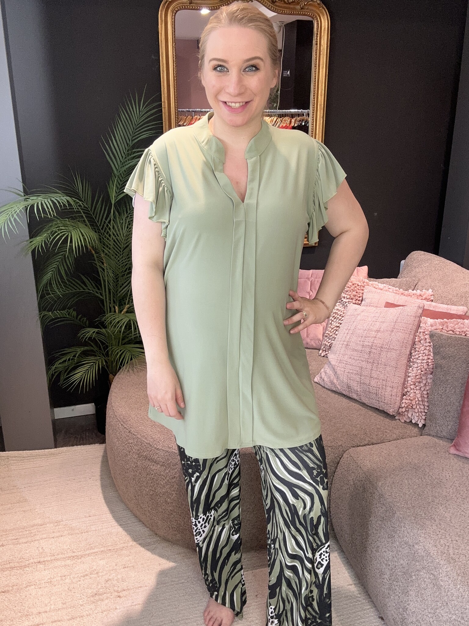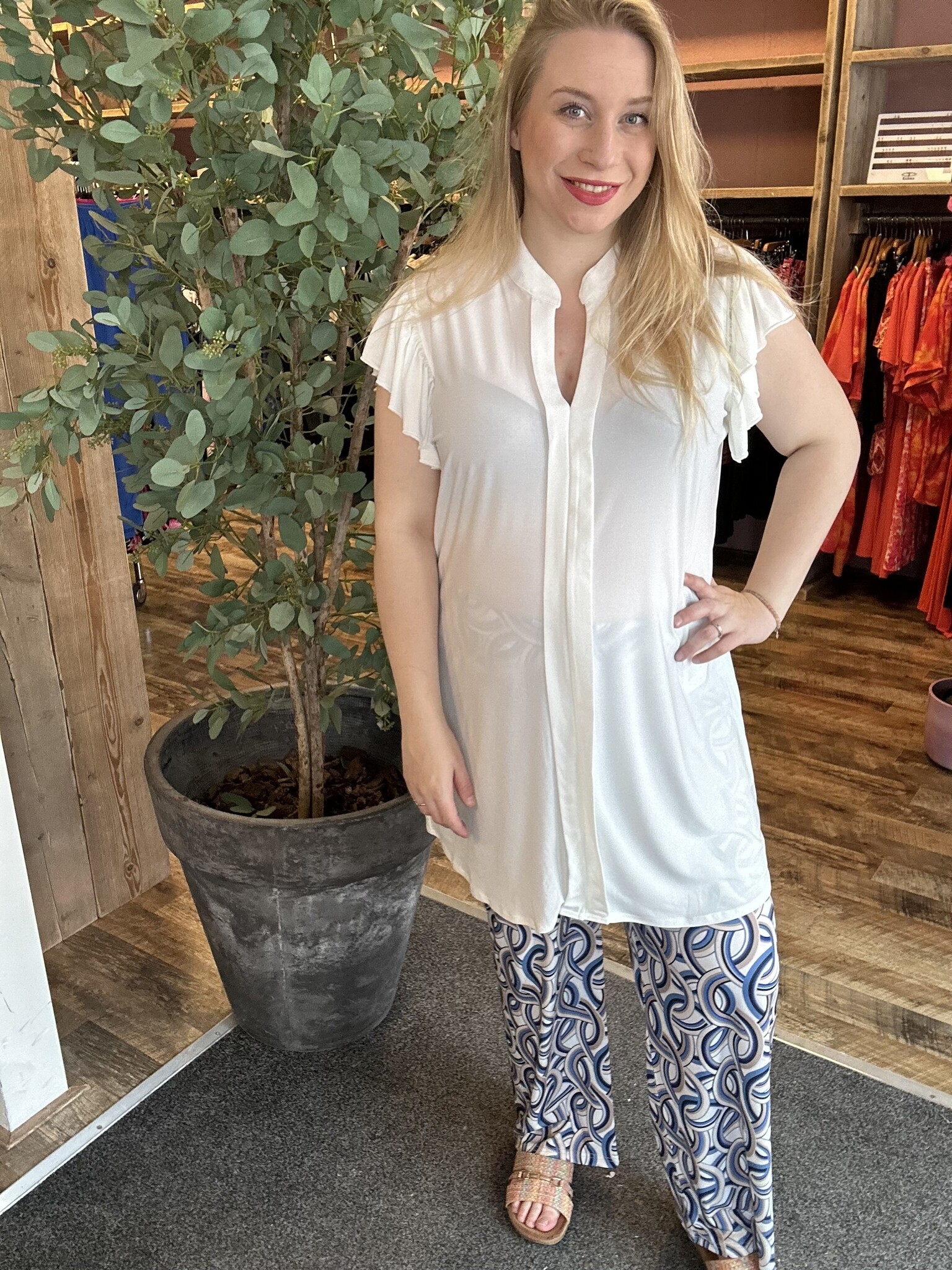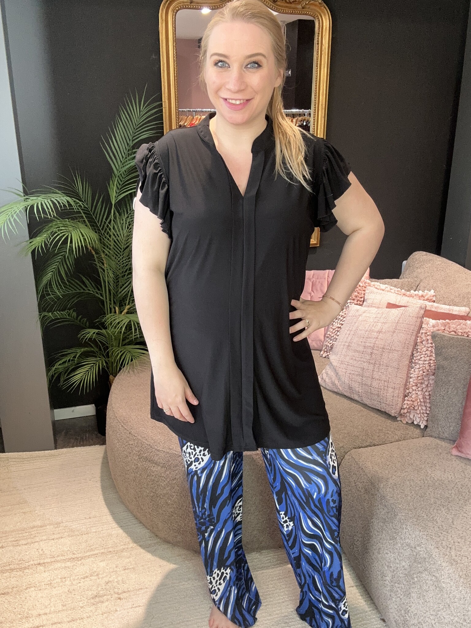 Super leuke tuniek van Magna fashion, met een mooie roesel bij de mouw. En hele leuke bies in het midden. Valt goed op maat.