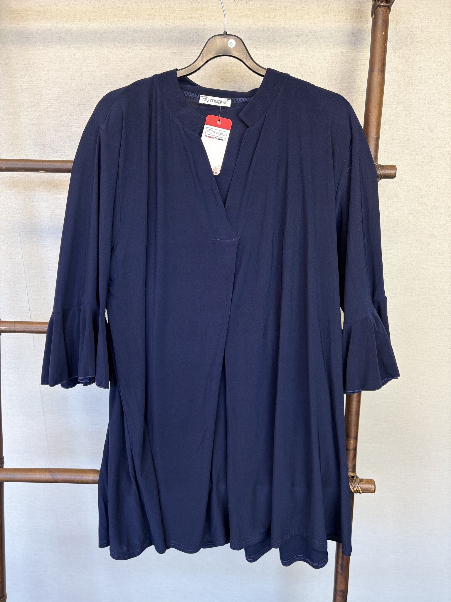 Deze donkerblauwe tuniek c-2503 van Magna Fashion zit comfortabel en heeft een losvallende pasvorm. De tuniek c-2503 heeft een mooie donkerblauwe kleur. Gemaakt van een luchtige stof dat zorgt voor een fijn draagcomfort. De tuniek c-2503 is afgewerkt met V-hals en driekwart trompet mouwen. Een casual tuniek c-2503 dat leuk te combineren is met een broek!