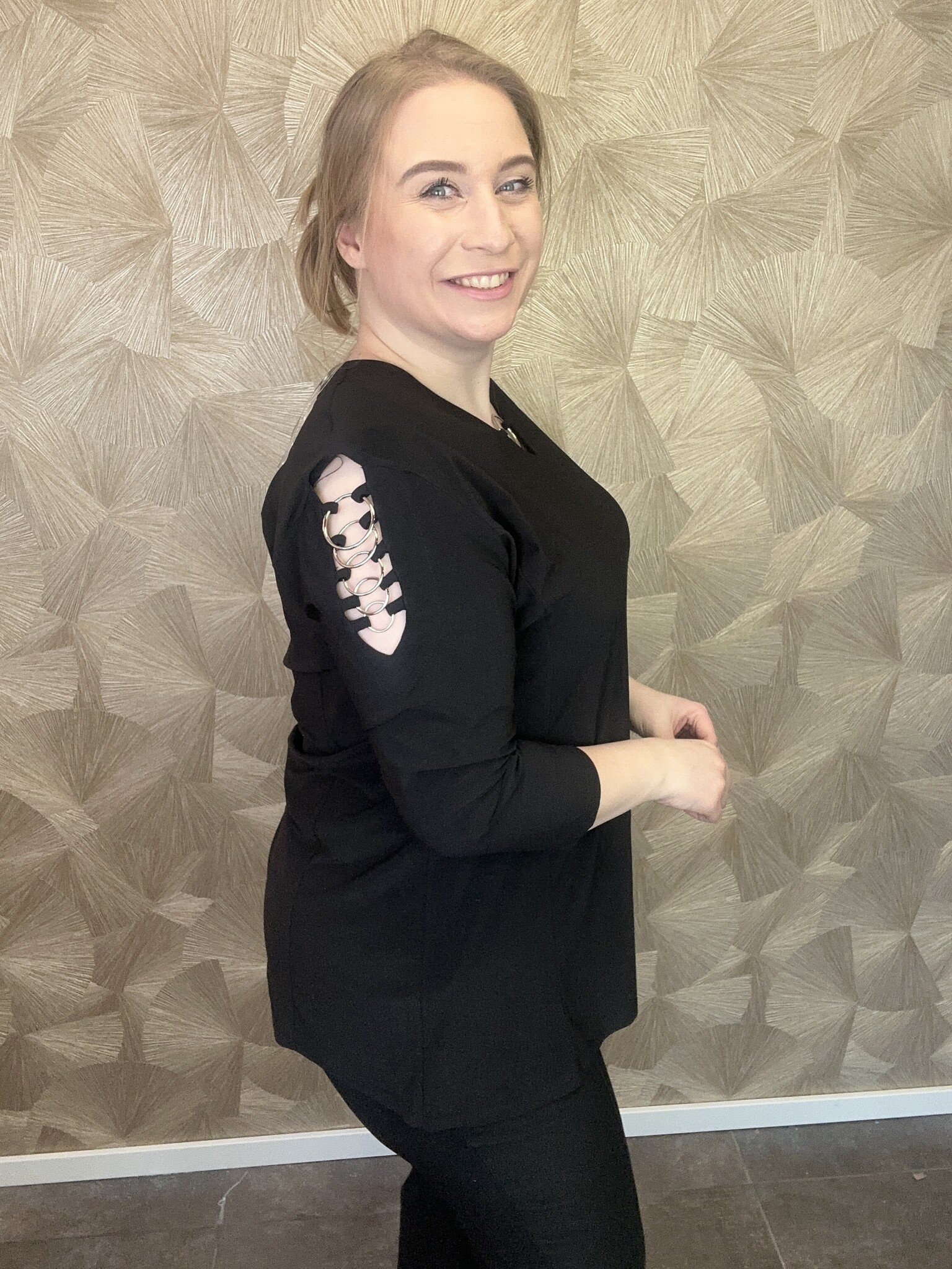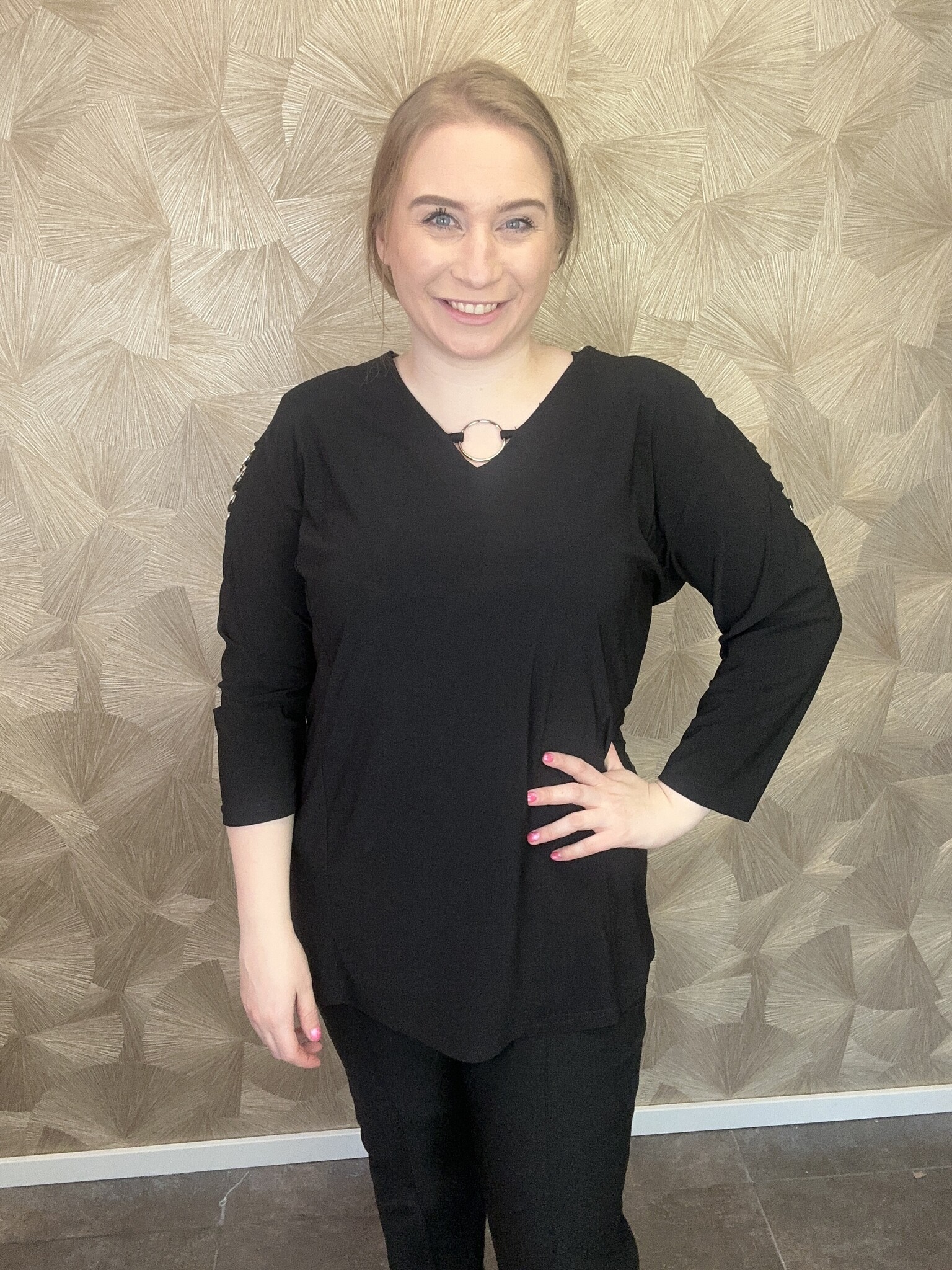 Deze tuniek Rieke is een fijne basic zwarte blouse met ringen op de mouwen en een ring aan de voorkant. Dit geeft de blouse net even dat extra! Deze blouse heeft lange mouwen en een lange pasvorm.