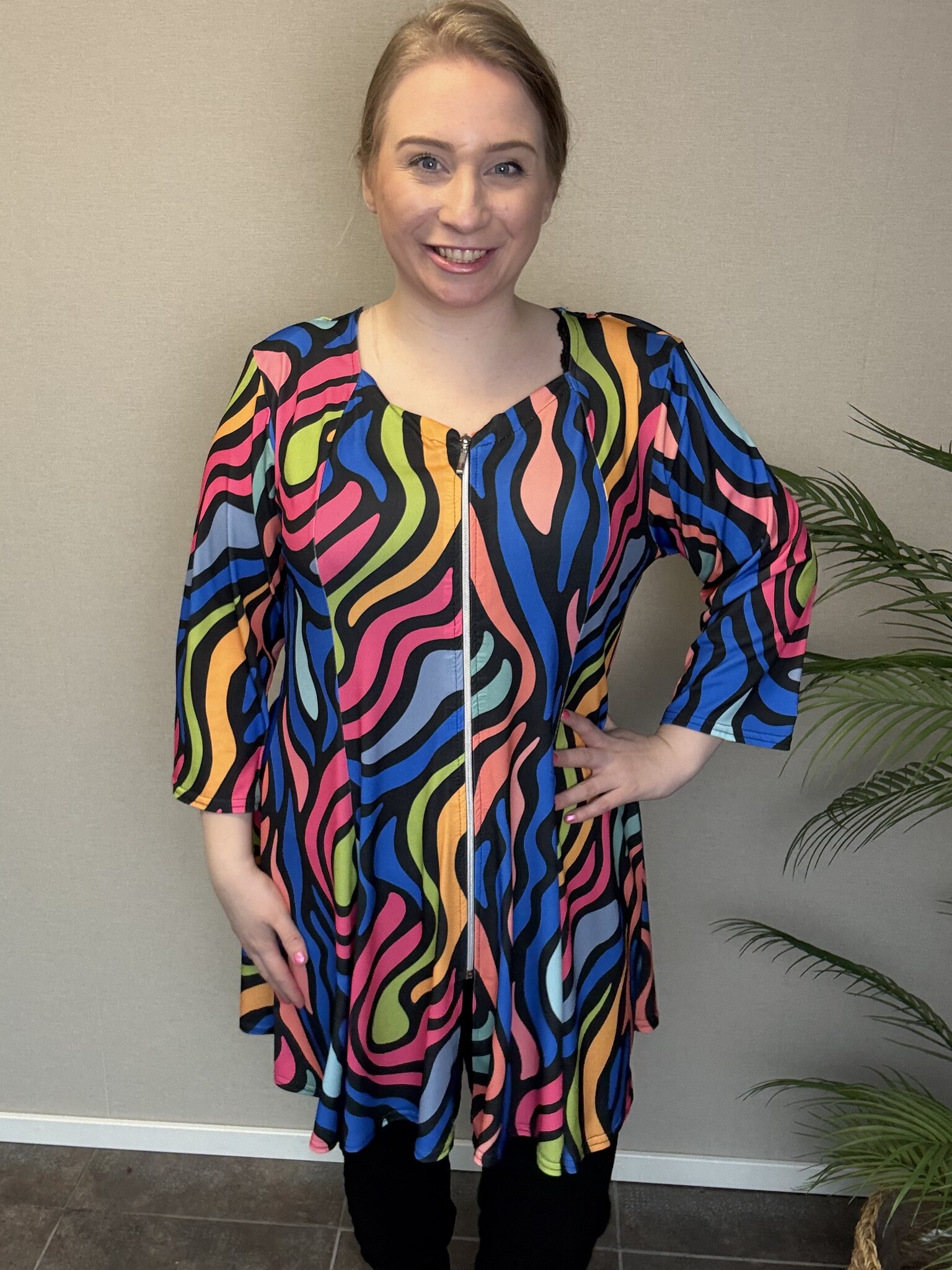 Het C-2606 vest Olivia van Magna Fashion en zit erg comfortabel door de stretchstof. Dit vest heeft een mooie V-hals en een rits aan de voorkant die helemaal open kan, zodat je het vest zowel open als dicht kan dragen. Dit vest heeft een mooie print in een sprekend kleurenpalet. Een perfect vest om het hele jaar te kunnen dragen, door het vest in de koudere maanden in laagjes te dragen.