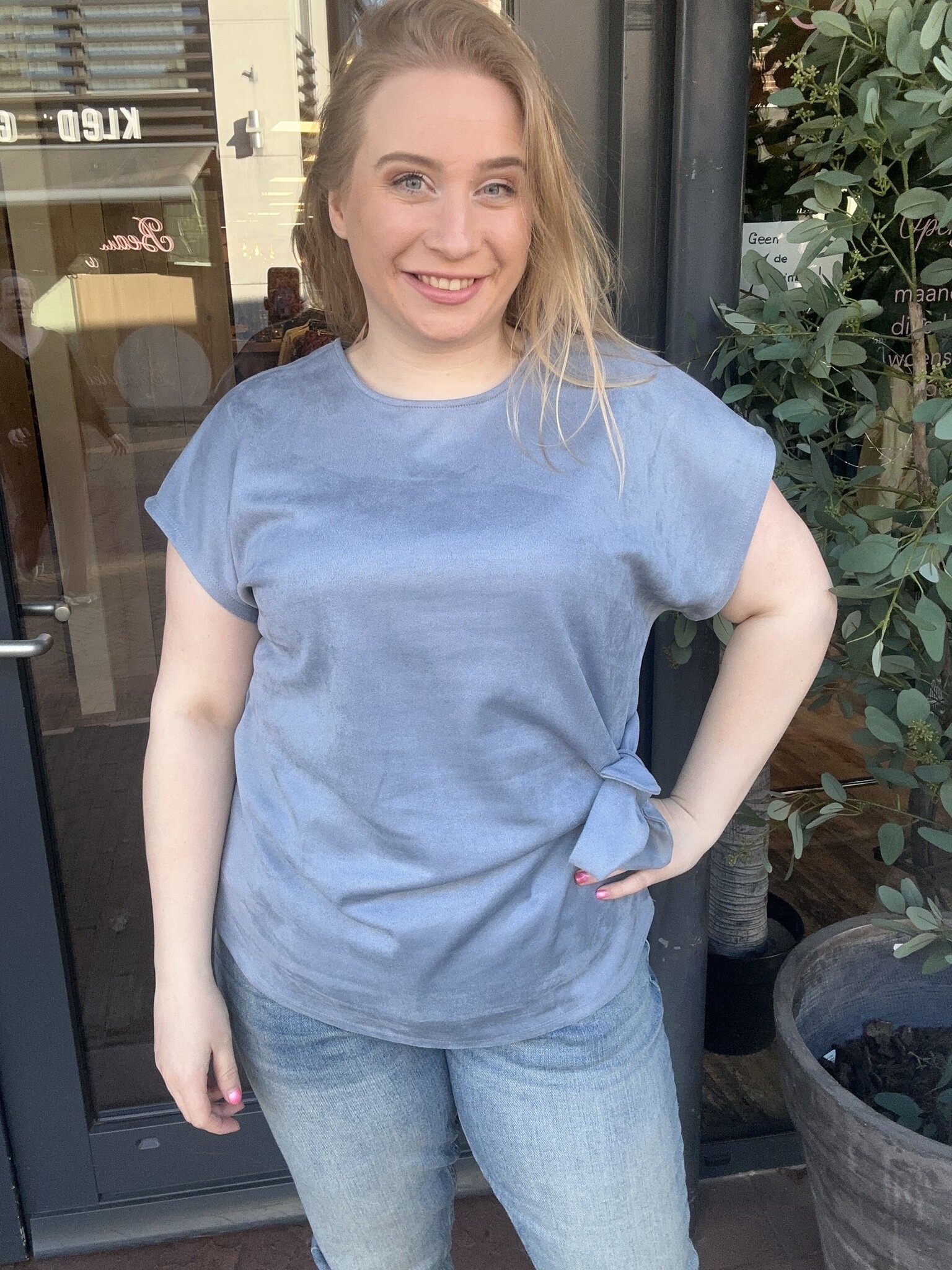 Vero Moda Curve - De VMBELLA SS FAUX SUEDE KNOT TOP JRS CUR in Skywriting is een zachte, stijlvolle top met een luxe faux suede look. De knoopdetail aan de voorkant geeft een speelse, flatterende twist.