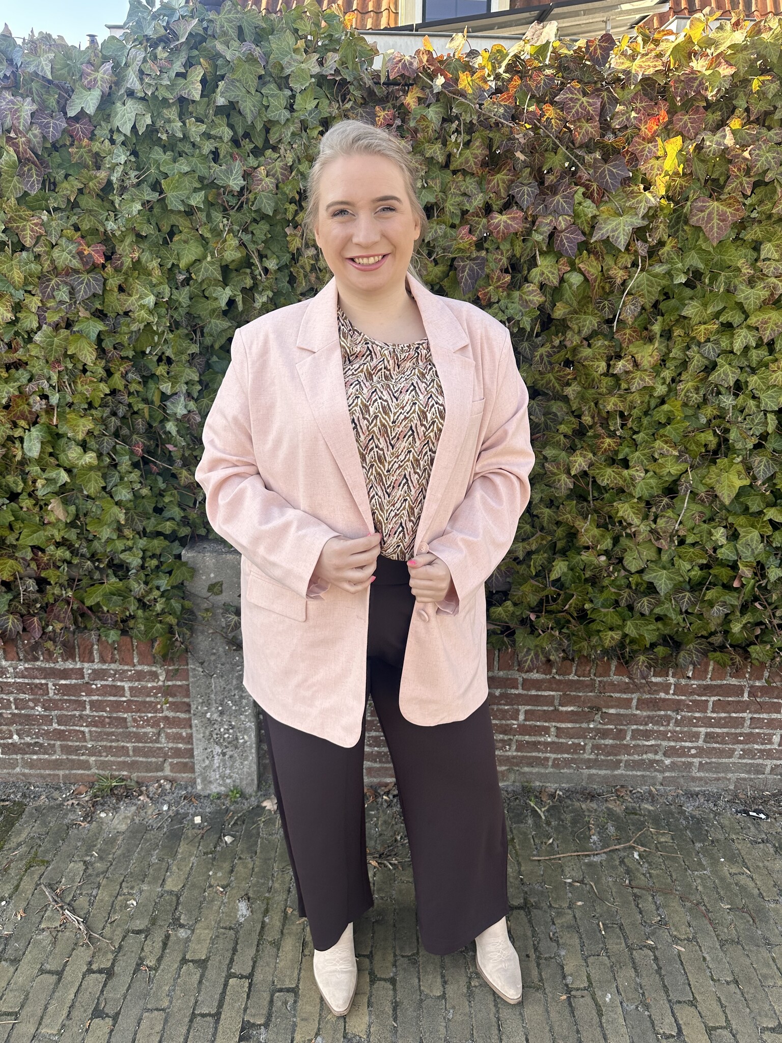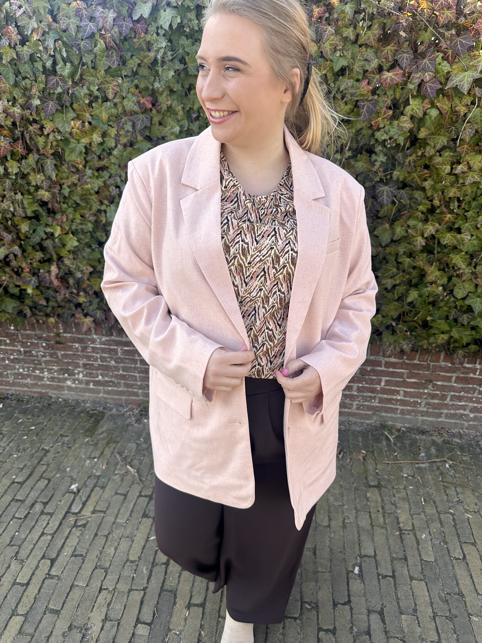 Wauw, wat een chique blazer! Deze blazer van Vero Moda Curve draagt heerlijk oversized en valt mooi. De blazer heeft een mooie roze kleur met een grijze melange en valt oversized. Deze blazer heeft schoudervullingen. Leuk te combineren met een nette pantalon voor een chique outfit.