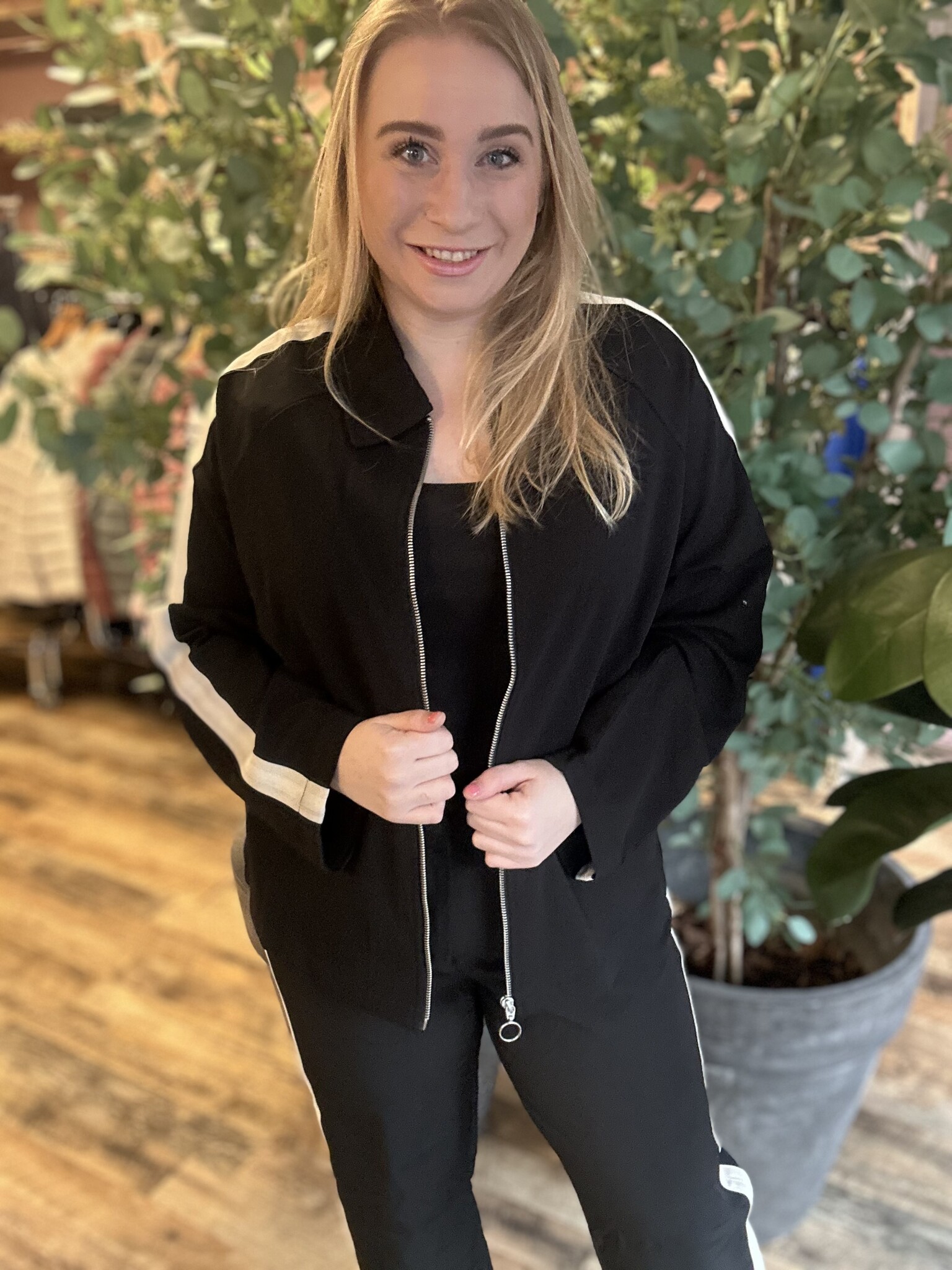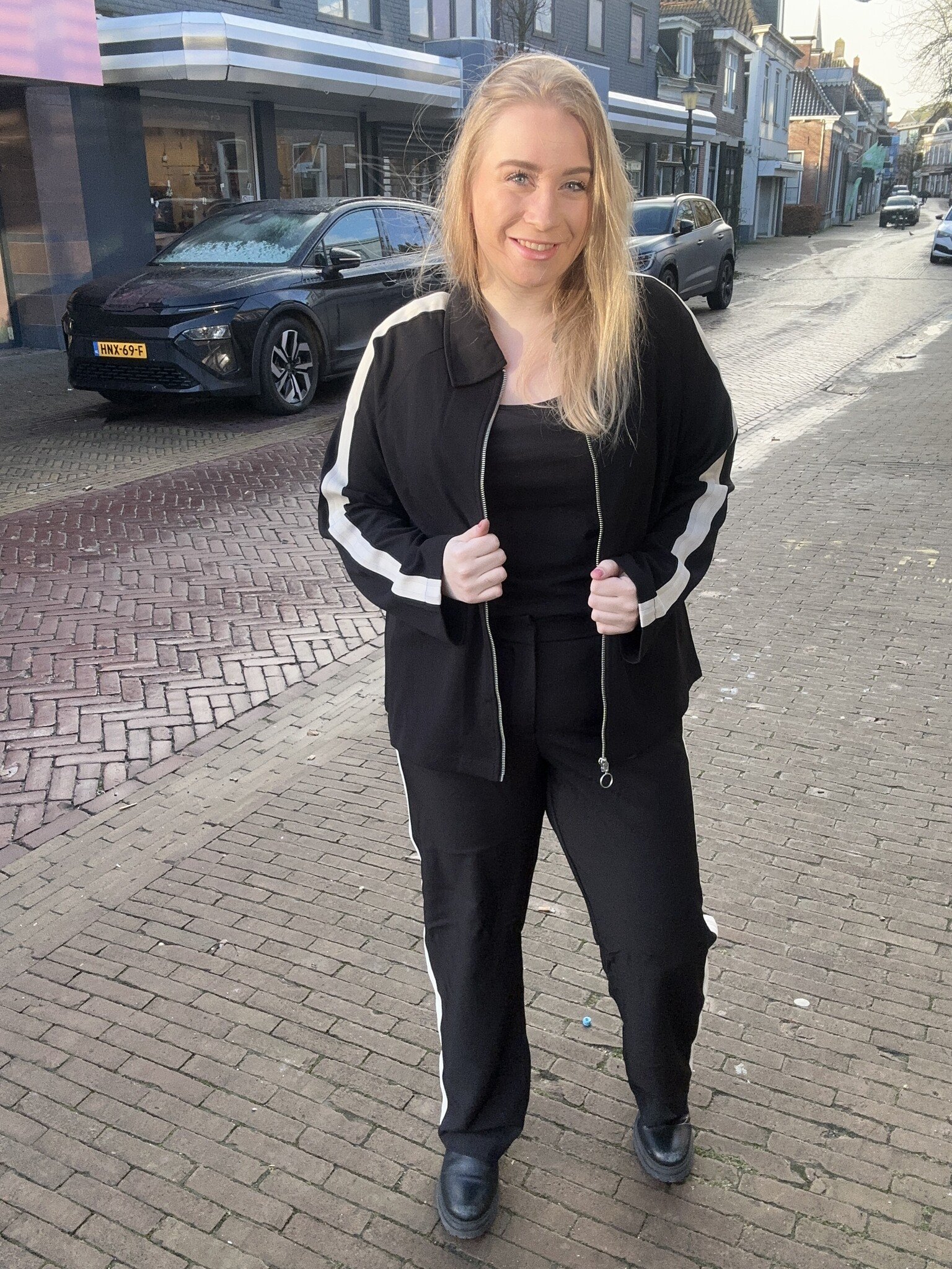 Vero Moda Curve - Een heel leuk zwart jasje met als detail, een witte bies over de zijkanten van boven naar onderen. Net als de bijpassende broek. Erg leuk om als set te combineren. Hij heeft een nette, sportieve uitstraling.
