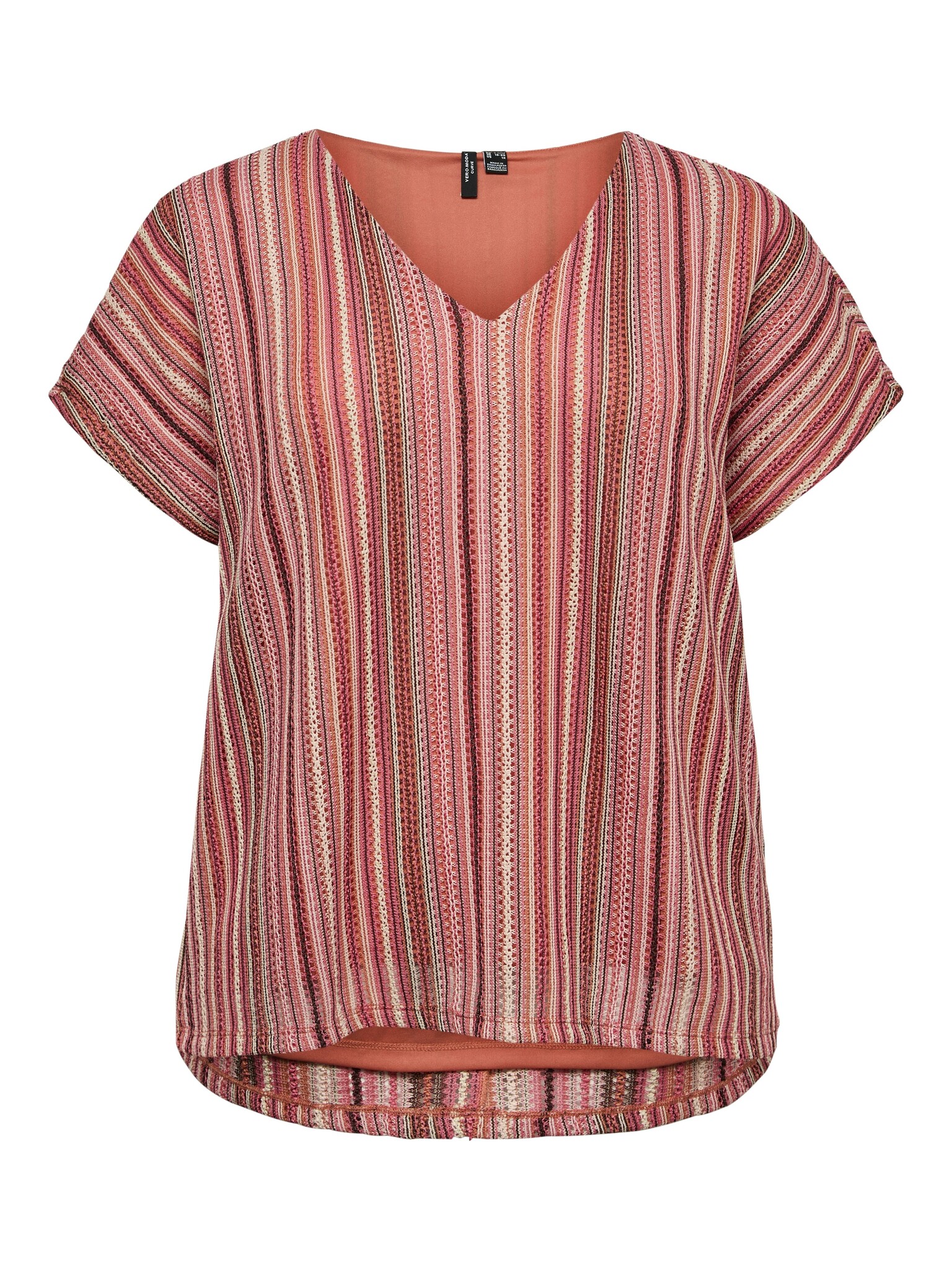 Dit meerkleurige shirt van Vero Moda Curve heeft een normale pasvorm. Het shirt heeft een mooi kleurenpatroon kleur met strepen in warme tinten. Gemaakt van een luchtige stof dat zorgt voor een fijn draagcomfort. Het shirt is afgewerkt met V-hals en korte mouwen. Een casual shirt dat leuk te combineren is met een jeans en sneaker!