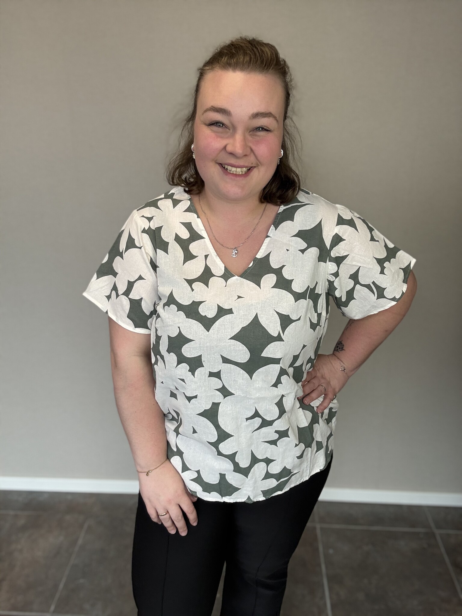 Wat een elegant shirt! Dit shirt van Vero Moda Curve draagt heerlijk. De groene kleur met de witte bloemen geven het shirt een chique uitstraling. De luchtige stof voelt prettig aan en draagt comfortabel. Het shirt heeft een mooie V-hals met wijde mouwen. Dit shirt staat altijd goed op een broek.