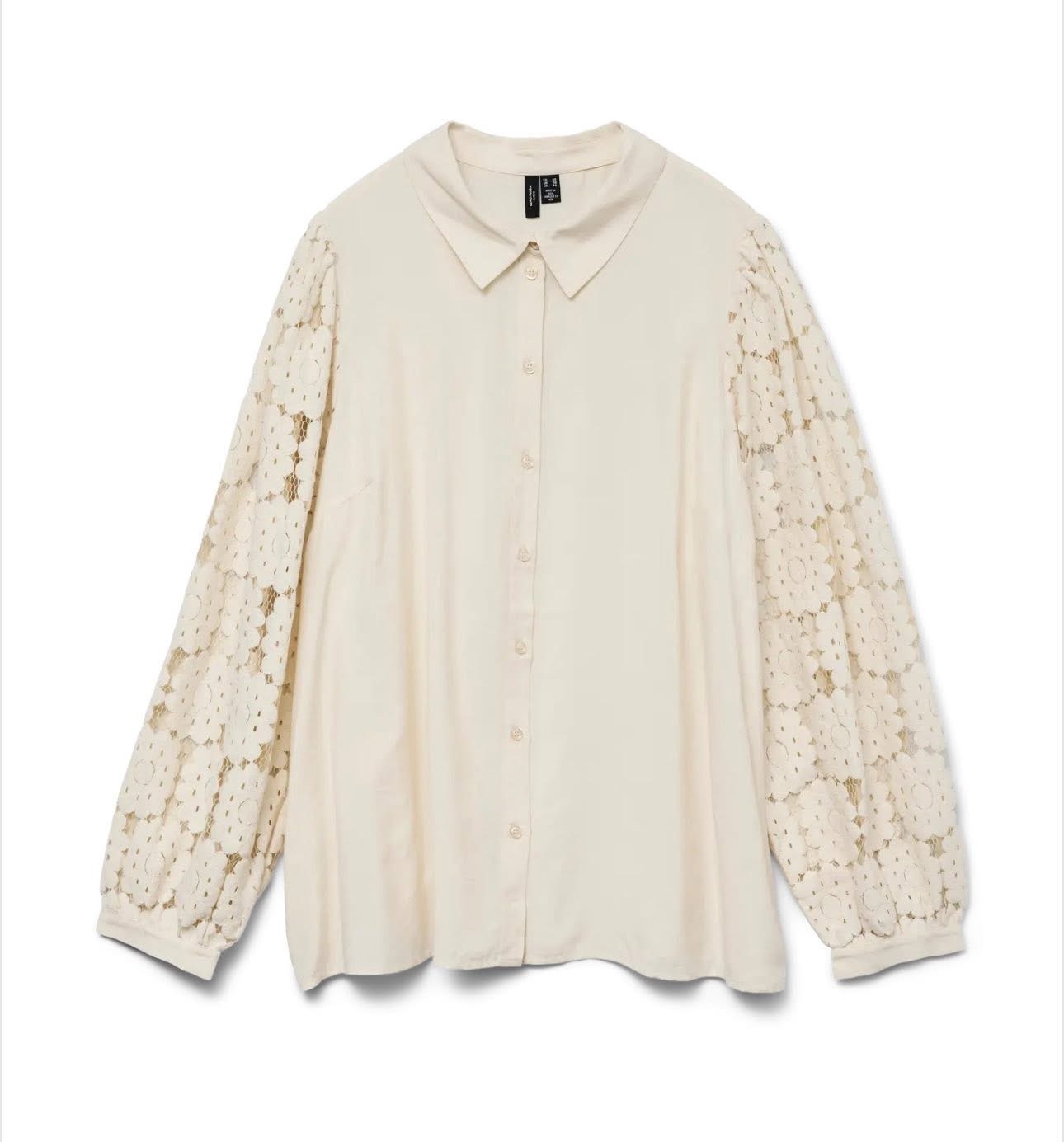Vero Moda Curve - Prachtige cremekleurige blouse van het merk Vero Moda Curve. De blouse is van onder tot boven doorgeknoopt & heeft prachtige bewerkte mouwen die zorgen voor een romantische touch. Valt goed op maat.