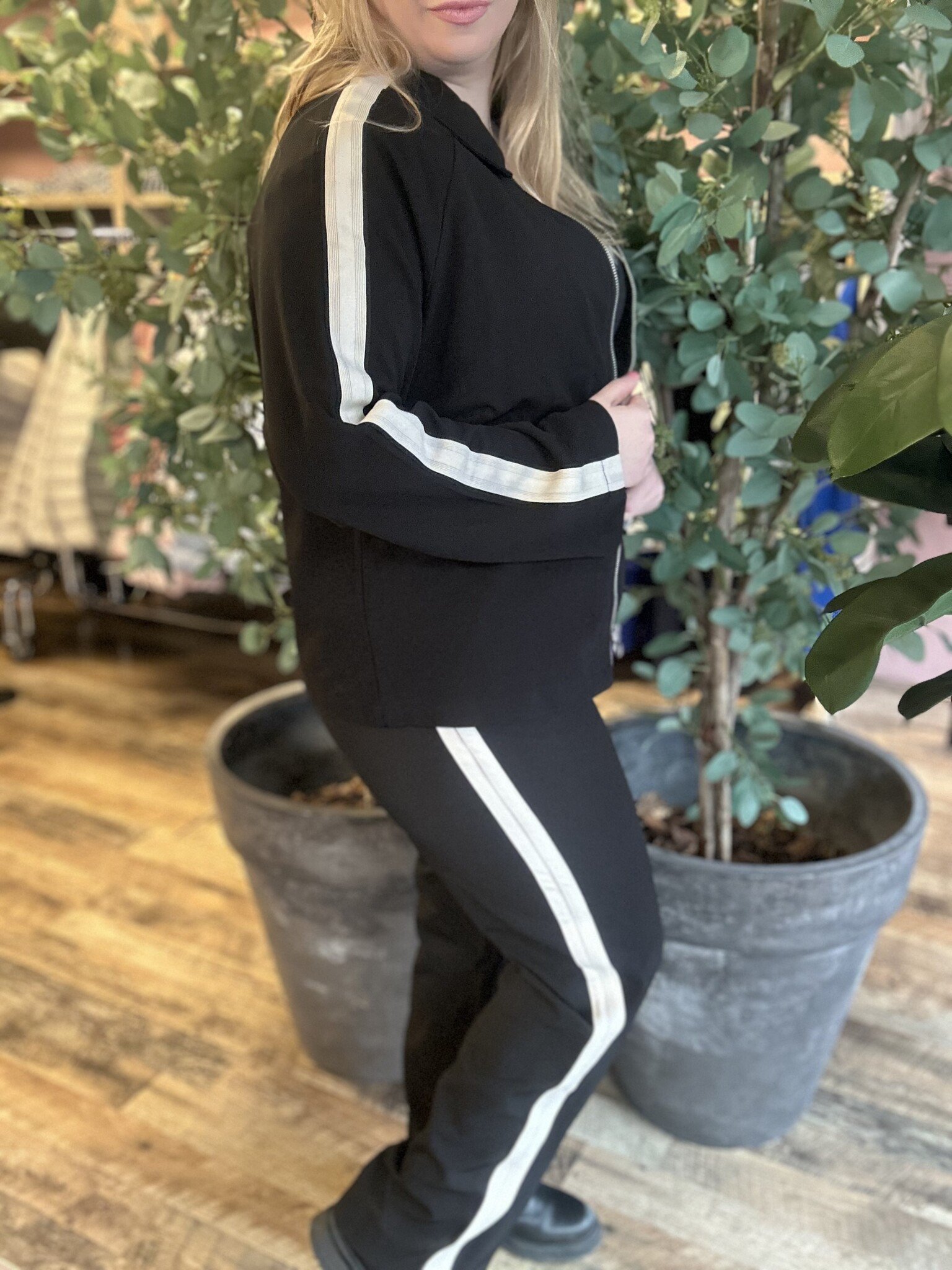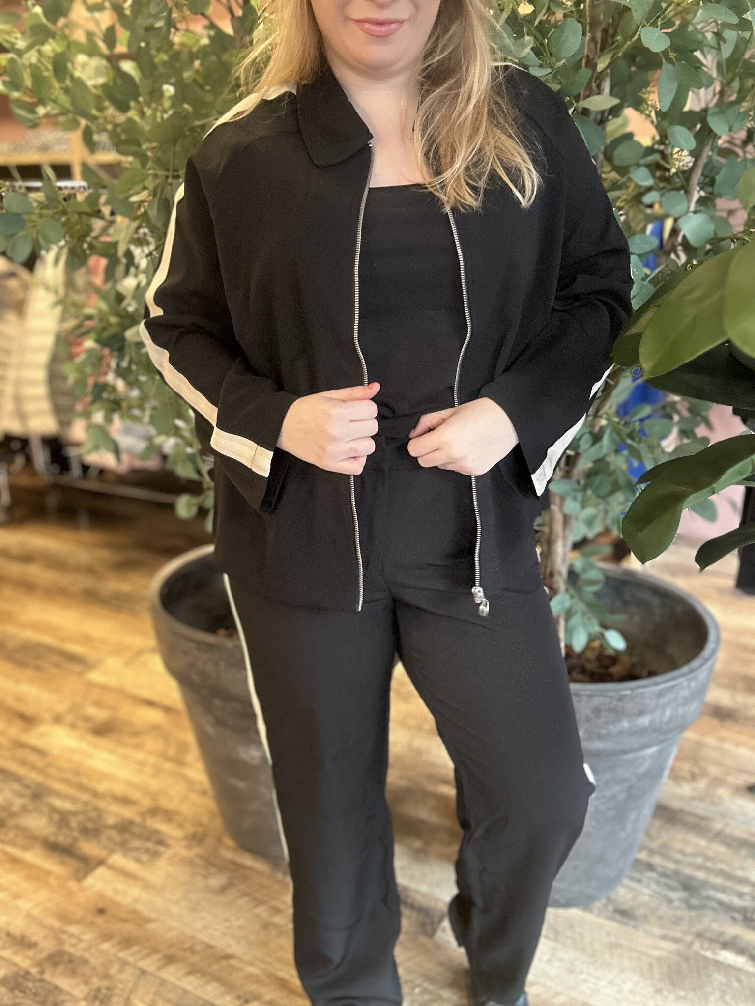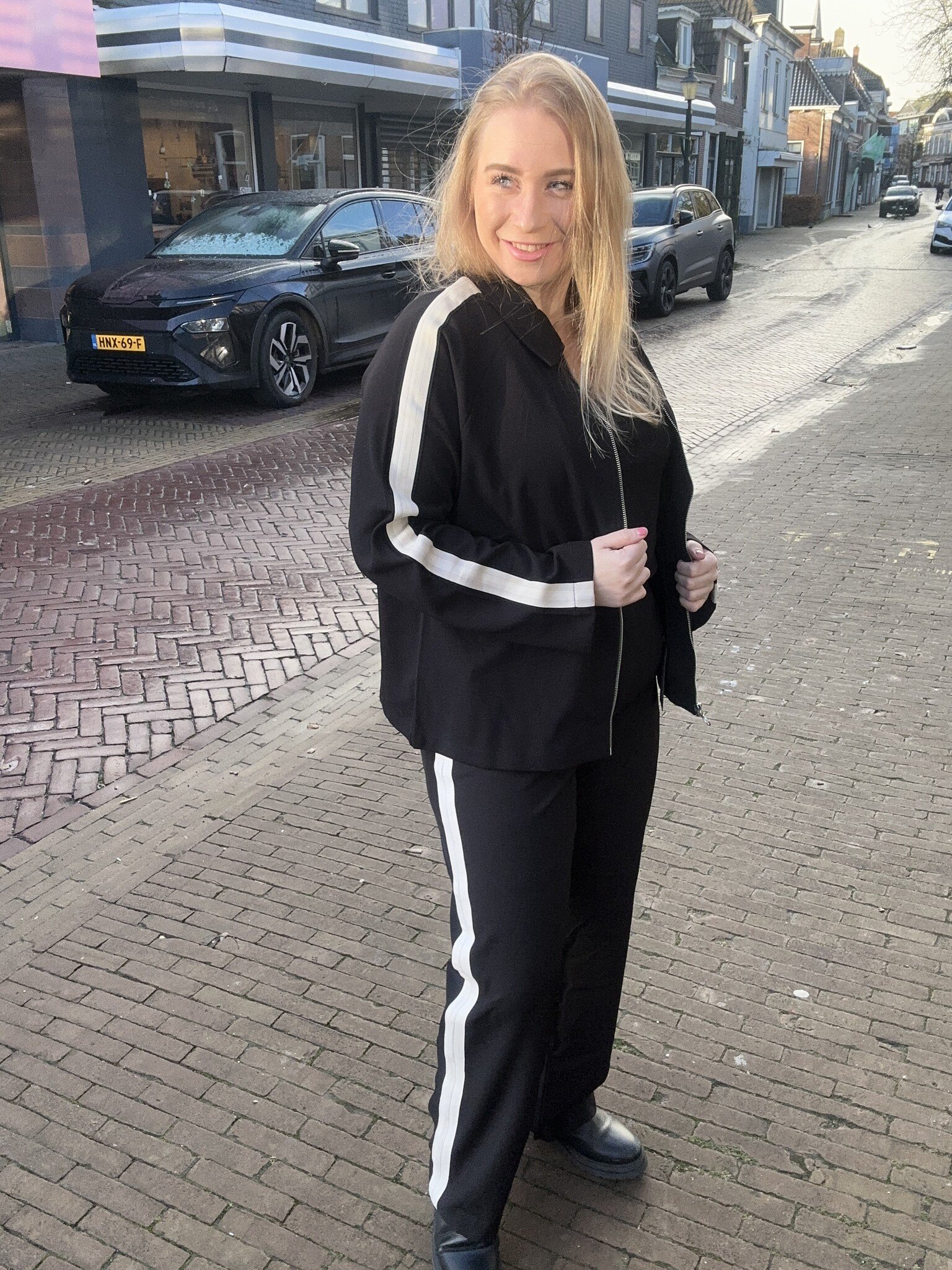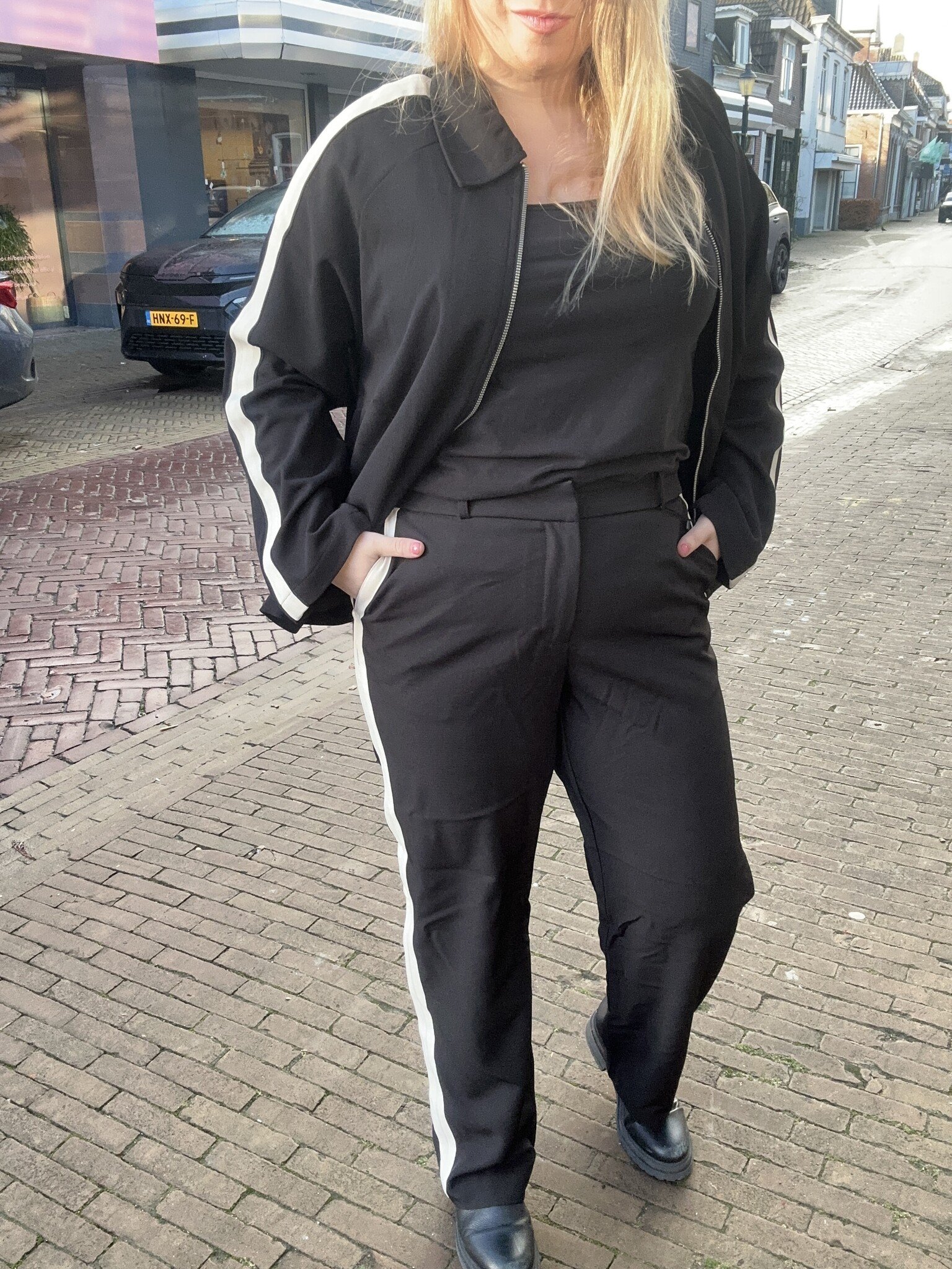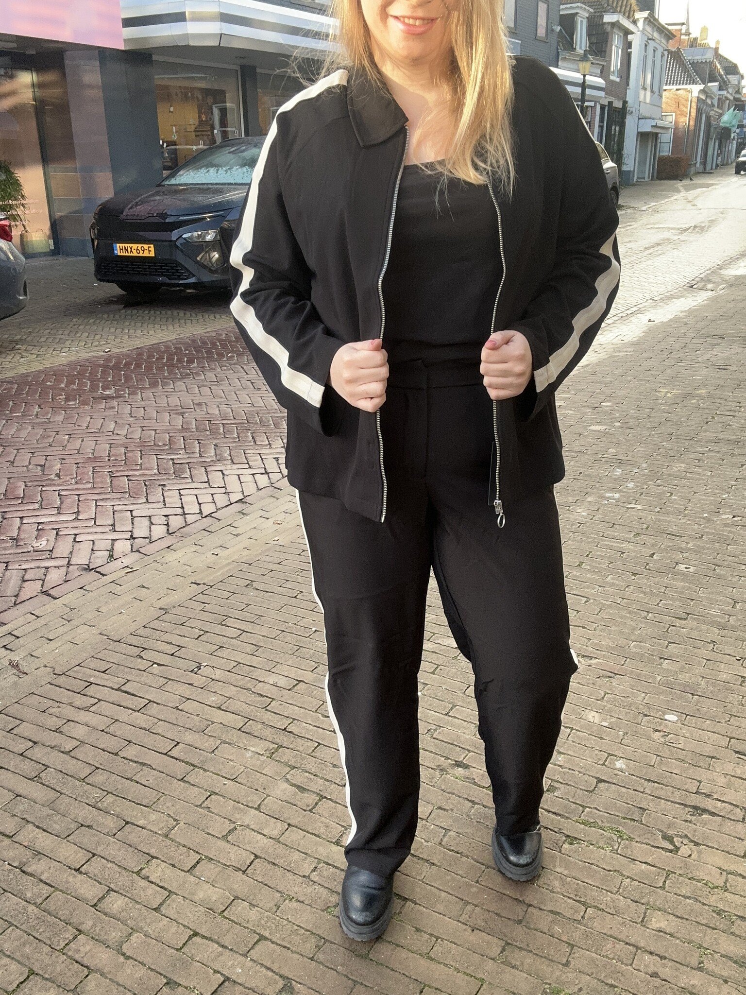 Vero Moda Curve - Een hele leuke zwarte broek met als detail, een witte bies over de zijkanten van boven naar onderen. Net als het bijpassende jasje. Erg leuk om als set te combineren. Hij heeft een nette, sportieve uitstraling.