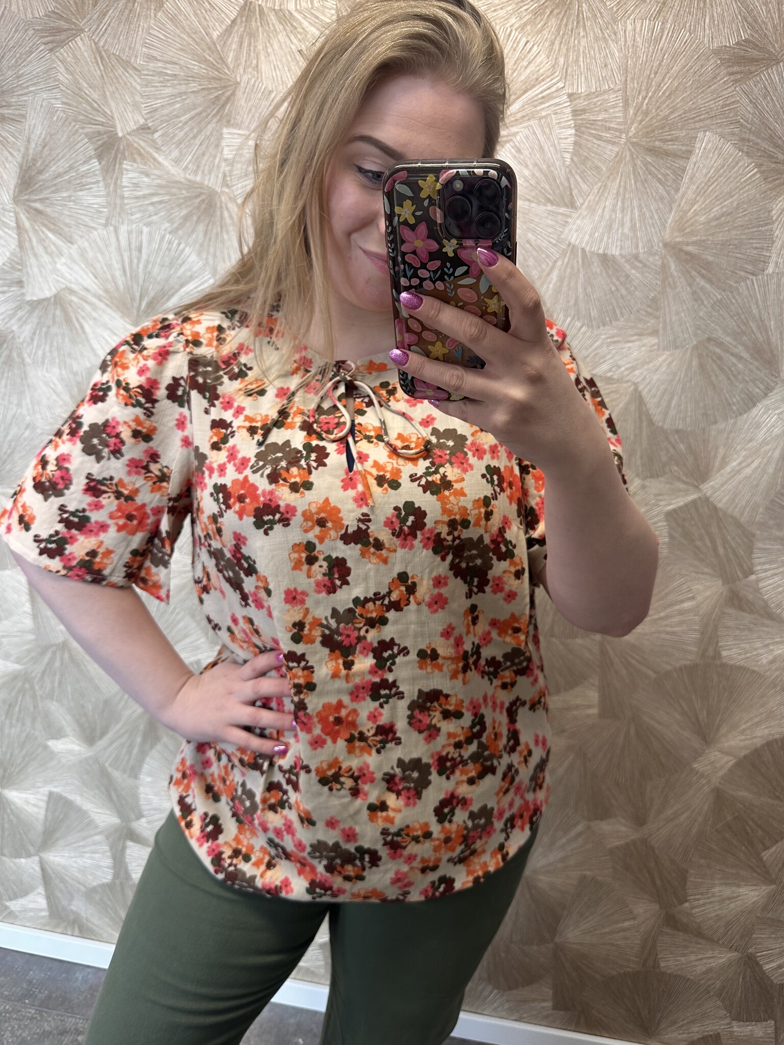 Dit crème shirt van Vero Moda Curve heeft een losvallende pasvorm. Het shirt heeft een zachte bloemenprint in roze, oranje, bruin en donkerrood. Gemaakt van een soepele stof dat zorgt voor een fijn draagcomfort. Het shirt is afgewerkt met een ronde hals met strikkoordje. Een casual shirt dat leuk te combineren is met een jeans!