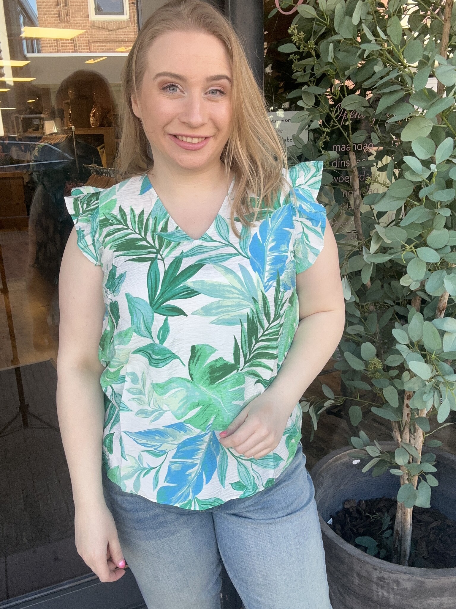Dit shirt van Vero Moda Curve heeft een mooie witte kleur met bladerenprint. Gemaakt van soepele stof, waardoor het item prettig draagt. De pasvorm heeft een los model. Dit model heeft een v-hals en mouwen met ruches. Leuk te combineren met andere items uit je kast.