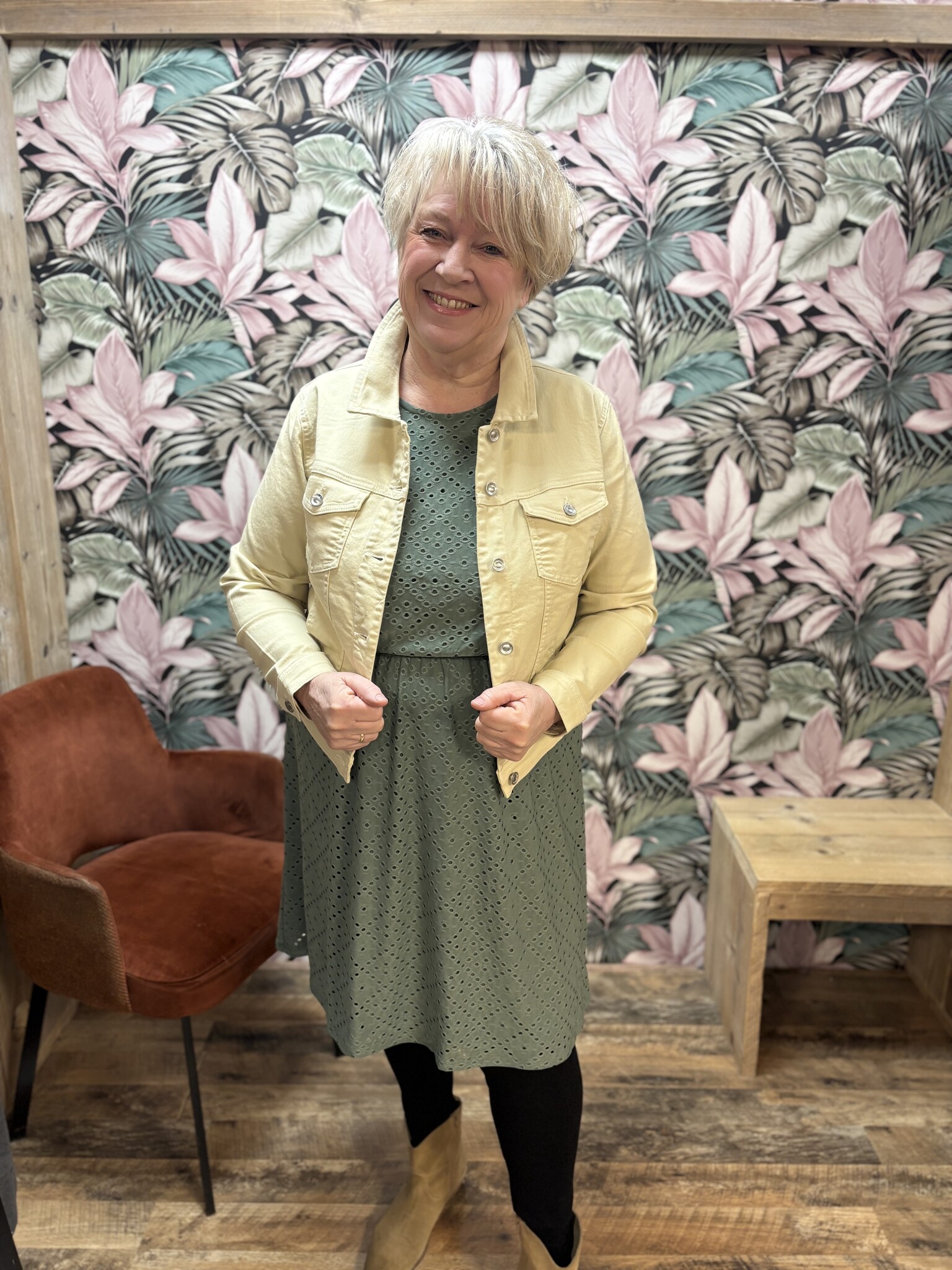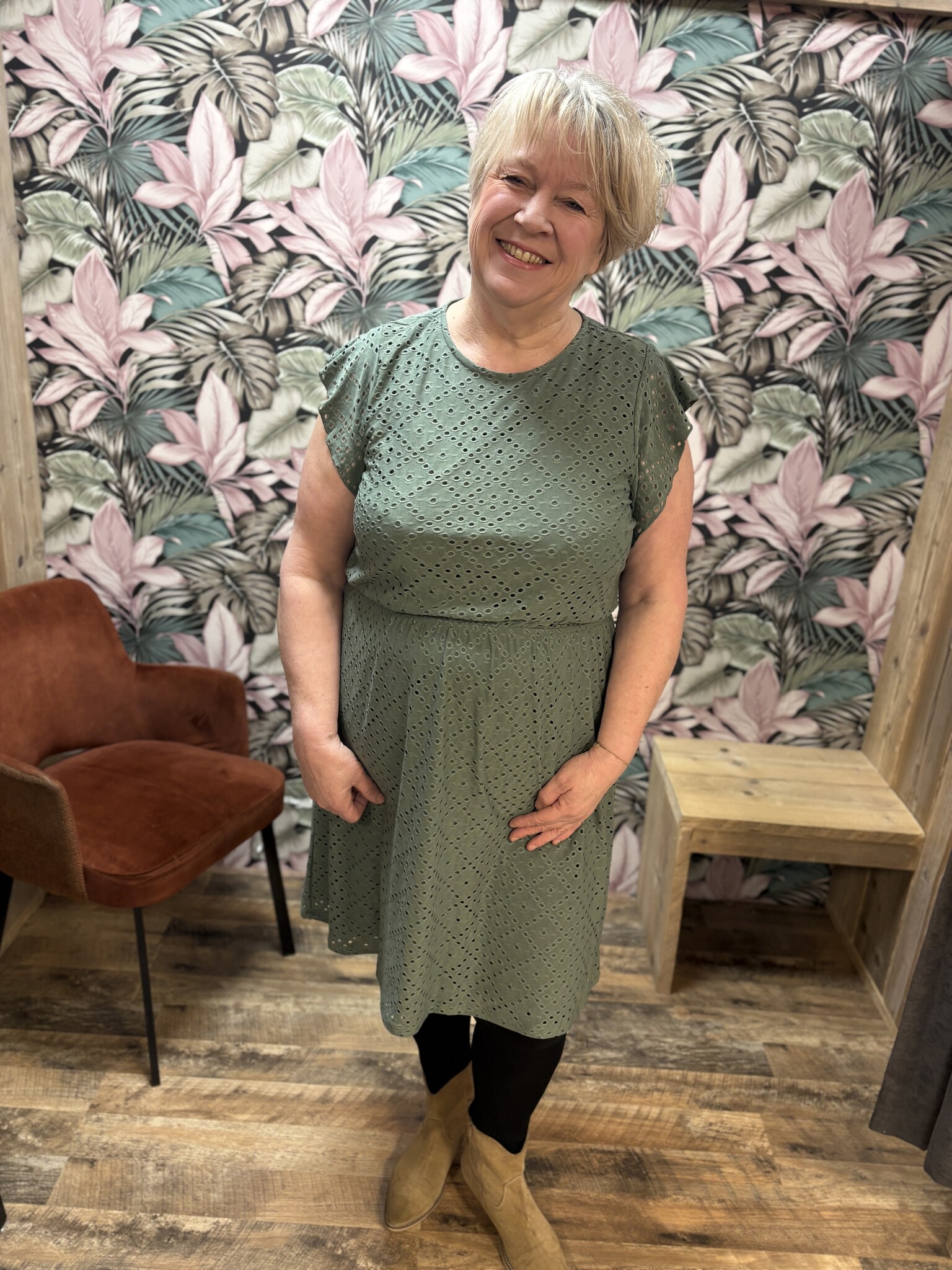 Deze mouwloze korte jurk in de kleur Laurel Wreath heeft een vrouwelijke uitstraling dankzij de speelse ruches. Gemaakt van een comfortabele jersey stof en perfect voor warme dagen. Ideaal voor zowel casual als zomerse gelegenheden. Een luchtige must-have voor je garderobe.