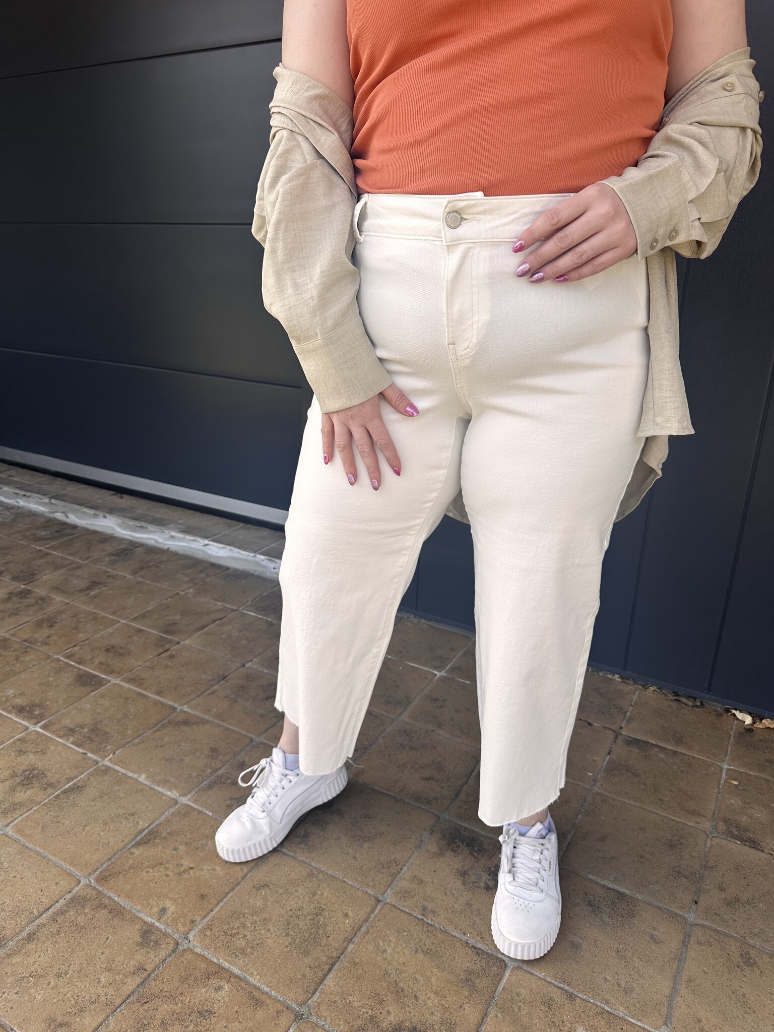 Deze witte 7/8 jeans van Vero Moda Curve heeft een trendy uitstraling met een high waist taille en een wide leg model. De achterkant is afgewerkt met zakken, terwijl de voorkant bewust strak en clean is gehouden voor een stijlvolle look. De onderkant is gerafeld. Een heerlijke zomerse broek die leuk te combineren is met een top.