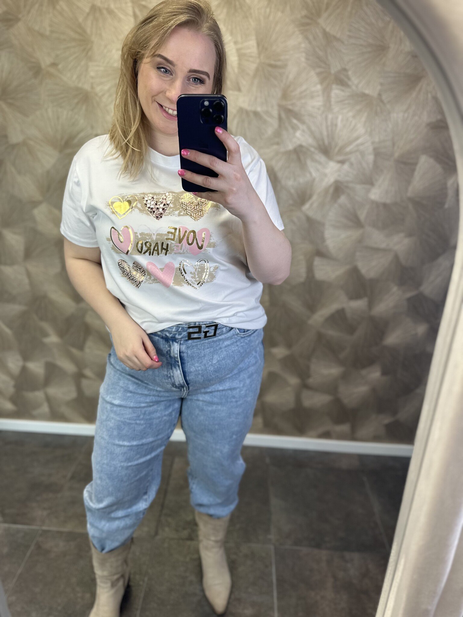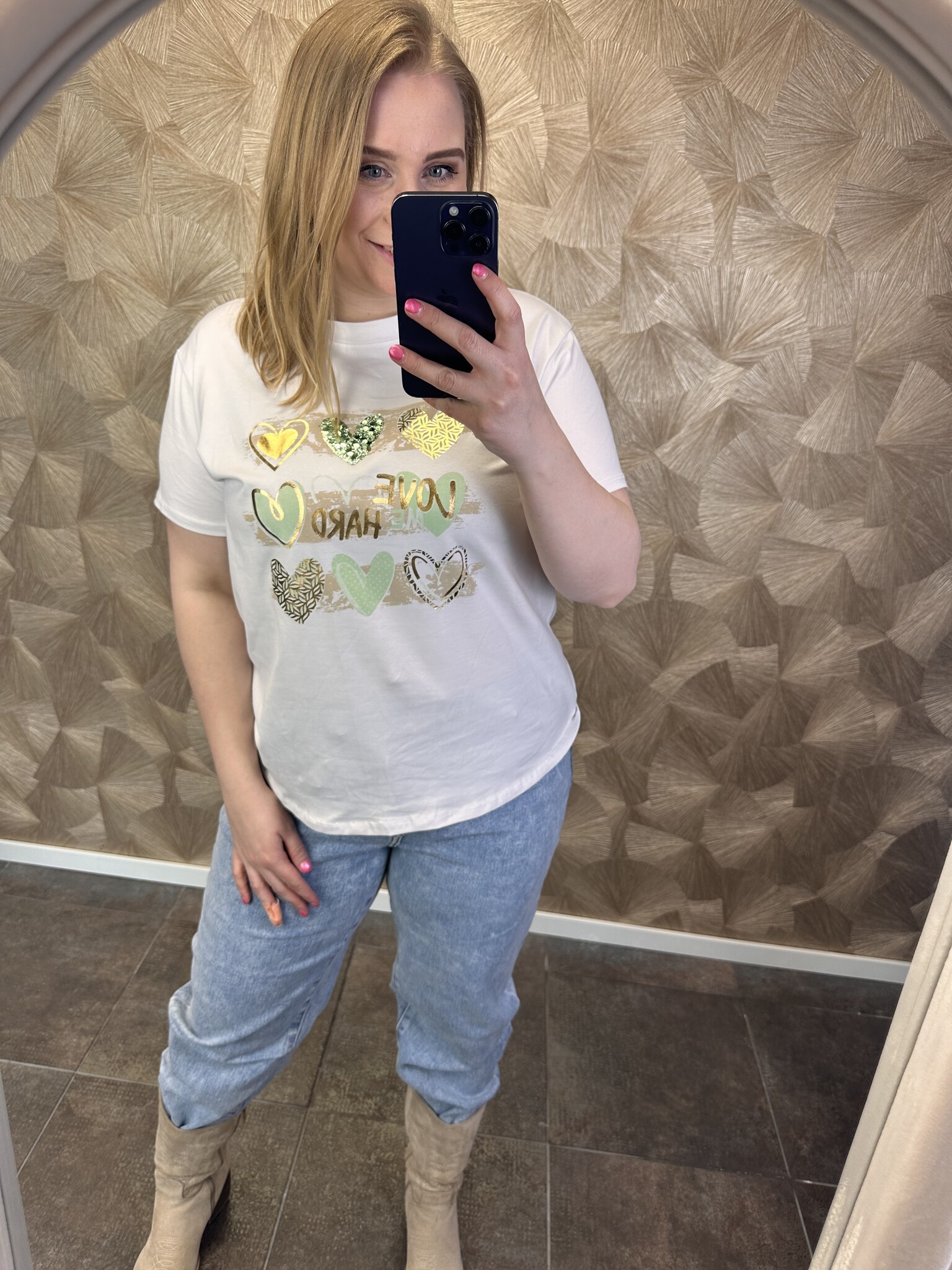 Dit te gekke witte T-shirt met meerdere hartjes in lichtroze en mintgroen is een vrolijk en speels item dat je look meteen opfleurt. Het hartjesmotief geeft het shirt een lieve, casual uitstraling en maakt het ideaal voor een zonnige, relaxte outfit.